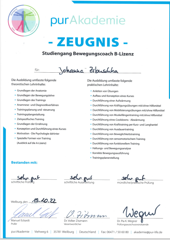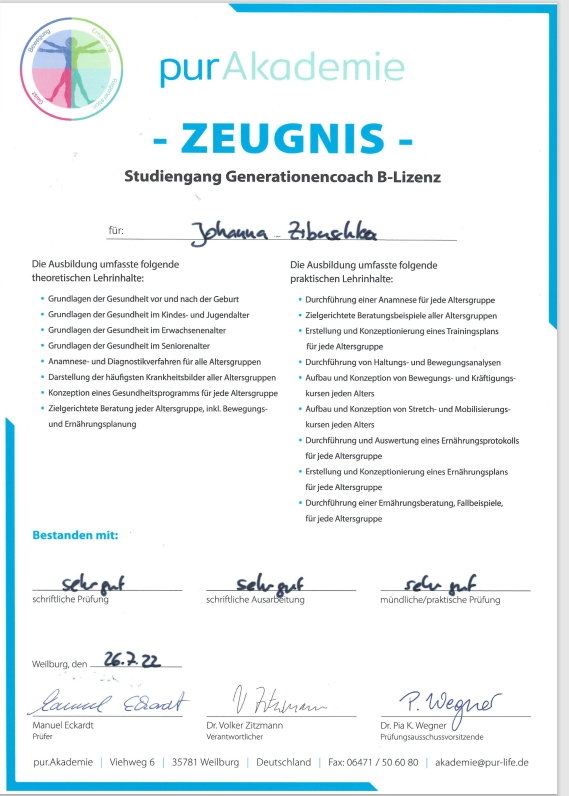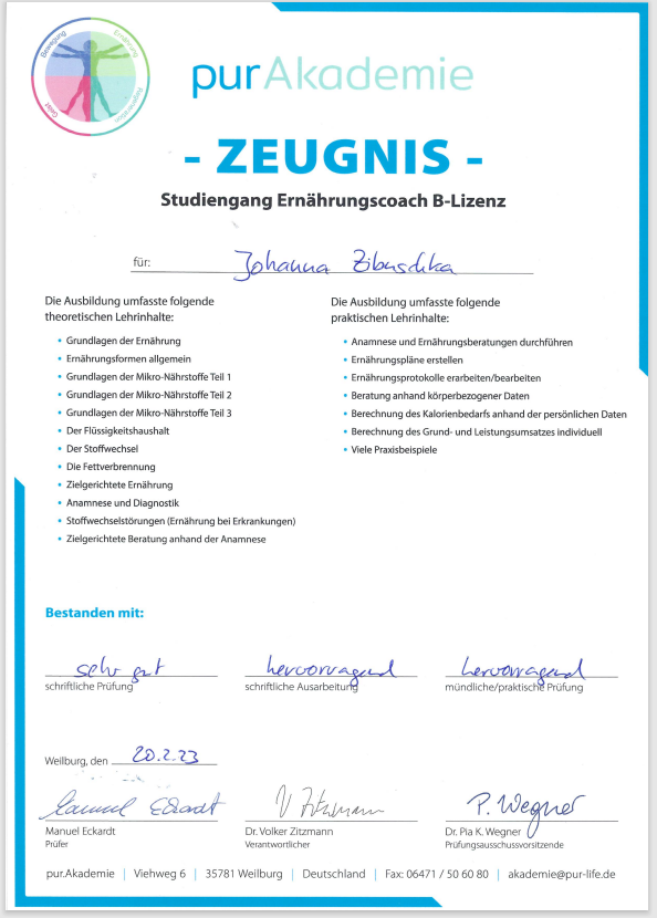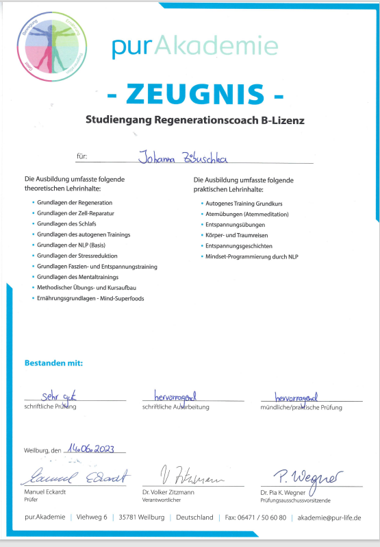 Ich durfte meine Ausbildung zum ganzheitlichen Gesundheitscoach bei der Pur-Akademie machen.